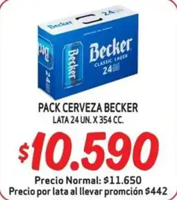 Mayorista 10 Pack cerveza Becker lata 24 un. x 354 cc. ofertaPack cerveza Becker lata 24 un. x 354 cc.Mayorista 10$12.490$9.290$3.200 Descuento25 octubre 202321 noviembre 2023