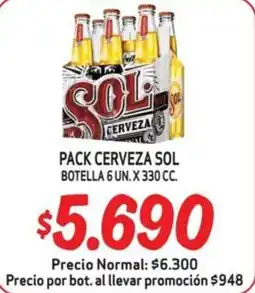 | Pack cerveza Sol botella 6 un. x 330 cc. | Mayorista 10 | $6.540 | $4.590 | $1.950 Descuento | 19 abril 2023 | 16 mayo 2023 |